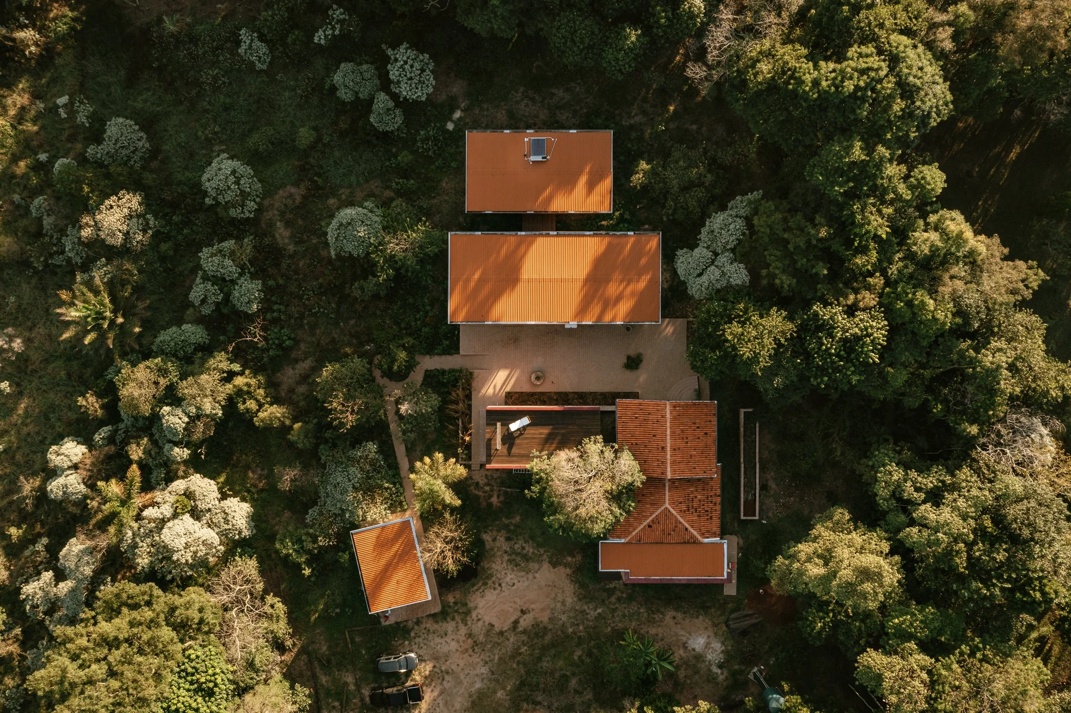 A premissa estrutural da casa está nos pilares de Aroeira, que são provenientes da antiga construção que havia no local: uma pequena residência cuja estrutura e fundação foram utilizados como ponto de partida para o novo lar da residência de Tatiana Antunes e do Instituto Saúva – um programa de Residência Artística fundado pela cliente.